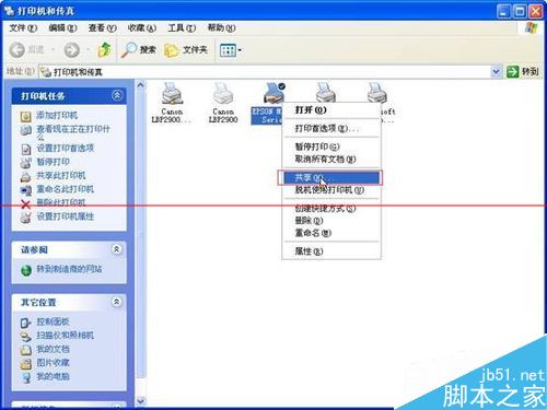 3、回到打印机和传真界面,选择需要共享的打印机,单击右键——共享,在弹出的对话框里选择 安全 选项卡。