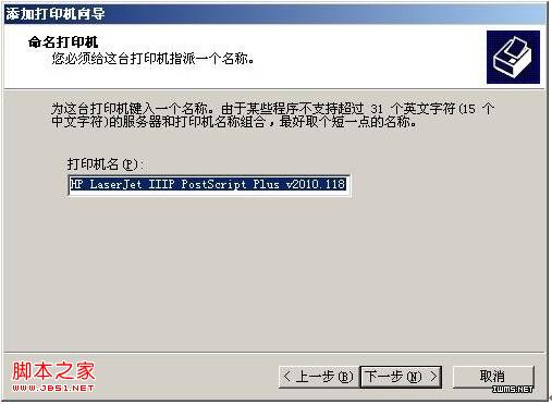 这一步没有什么可以说的,大家输入打印机的名称,也就是显示在“打印机和传真”窗口中的名字,也可以保持默认值。如果只安装一个打印机,就没有修改的必要了。
