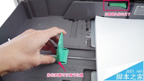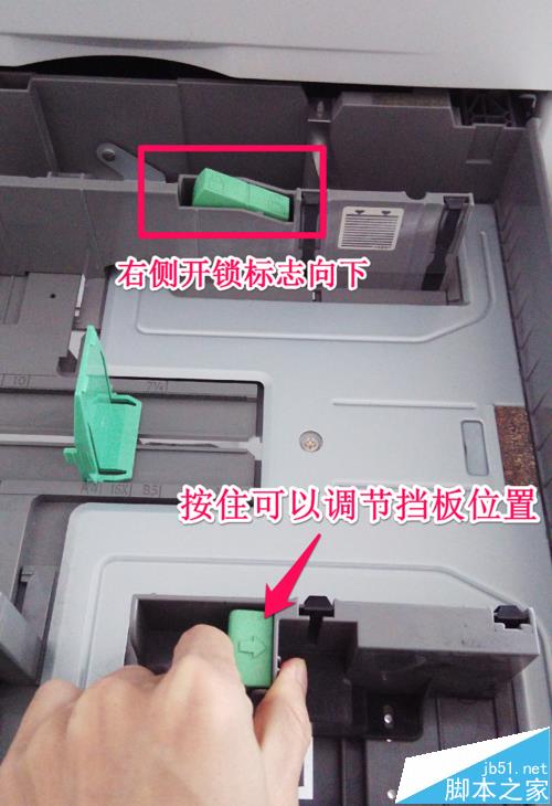 5、将纸盒中开关锁右侧的开锁标志按下,此时我们按住下面挡板的绿色零件就可以调节下方挡板的位置了。