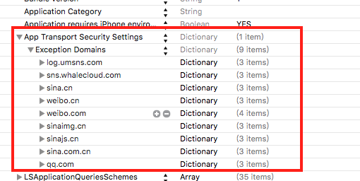 <key>NSAppTransportSecurity</key><dict><key>NSExceptionDomains</key><dict><key>log.umsns.com</key><dict><key>NSIncludesSubdomains</key><true/><key>NSTemporaryExceptionAllowsInsecureHTTPLoads</key><true/><key>NSTemporaryExceptionMinimumTLSVersion</key><string>TLSv1.1</string></dict><key>sns.whalecloud.com</key><dict><key>NSIncludesSubdomains</key><true/><key>NSTemporaryExceptionAllowsInsecureHTTPLoads</key><true/><key>NSTemporaryExceptionMinimumTLSVersion</key><string>TLSv1.1</string></dict><!-- 集成新浪微博对应的HTTP白名单--><key>sina.cn</key><dict><key>NSIncludesSubdomains</key><true/><key>NSThirdPartyExceptionRequiresForwardSecrecy</key><false/></dict><key>sina.cn</key><dict><!-- 适配iOS10 --><key>NSExceptionMinimumTLSVersion</key><string>TLSv1.0</string><key>NSIncludesSubdomains</key><true/><key>NSThirdPartyExceptionRequiresForwardSecrecy</key><false/></dict><key>weibo.cn</key><dict><!-- 适配iOS10 --><key>NSExceptionMinimumTLSVersion</key><string>TLSv1.0</string><key>NSIncludesSubdomains</key><true/><key>NSThirdPartyExceptionRequiresForwardSecrecy</key><false/></dict><key>weibo.com</key><dict><!-- 适配iOS10 --><key>NSExceptionMinimumTLSVersion</key><string>TLSv1.0</string><key>NSIncludesSubdomains</key><true/><key>NSThirdPartyExceptionAllowsInsecureHTTPLoads</key><true/><key>NSThirdPartyExceptionRequiresForwardSecrecy</key><false/></dict><key>sinaimg.cn</key><dict><key>NSIncludesSubdomains</key><true/><key>NSThirdPartyExceptionAllowsInsecureHTTPLoads</key><true/><key>NSThirdPartyExceptionRequiresForwardSecrecy</key><false/></dict><key>sinajs.cn</key><dict><key>NSIncludesSubdomains</key><true/><key>NSThirdPartyExceptionAllowsInsecureHTTPLoads</key><true/><key>NSThirdPartyExceptionRequiresForwardSecrecy</key><false/></dict><key>sina.com.cn</key><dict><key>NSIncludesSubdomains</key><true/><key>NSThirdPartyExceptionAllowsInsecureHTTPLoads</key><true/><key>NSThirdPartyExceptionRequiresForwardSecrecy</key><false/></dict><!-- 新浪微博--><!-- 集成微信、QQ、Qzone、腾讯微博授权对应的HTTP白名单--><key>qq.com</key><dict><key>NSIncludesSubdomains</key><true/><key>NSThirdPartyExceptionAllowsInsecureHTTPLoads</key><true/><key>NSThirdPartyExceptionRequiresForwardSecrecy</key><false/></dict><!-- 腾讯授权--><!-- 集成人人授权对应的HTTP白名单--><key>renren.com</key><dict><key>NSIncludesSubdomains</key><true/><key>NSThirdPartyExceptionAllowsInsecureHTTPLoads</key><true/><key>NSThirdPartyExceptionRequiresForwardSecrecy</key><false/></dict><!-- 人人授权--><!-- 集成Facebook授权对应的HTTP白名单--><key>facebook.com</key><dict><key>NSIncludesSubdomains</key><true/> <key>NSExceptionRequiresForwardSecrecy</key><false/></dict><key>fbcdn.net</key><dict><key>NSIncludesSubdomains</key><true/><key>NSExceptionRequiresForwardSecrecy</key><false/></dict><key>akamaihd.net</key><dict><key>NSIncludesSubdomains</key><true/><key>NSExceptionRequiresForwardSecrecy</key><false/></dict><!-- Facebook授权--><!-- 集成Twitter授权对应的HTTP白名单--><key>twitter.com</key><dict><key>NSIncludesSubdomains</key><true/> <key>NSExceptionRequiresForwardSecrecy</key><false/></dict><!-- Twitter授权--></dict></dict>
