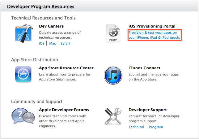 (1) 登录iOS Dev Center,登录成功后,点击(iOS Provisioning Portal对应链接),如图所示: