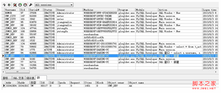 1、 查看当前被解锁的对象 示例: 将表aa加锁 执行 select * from aa for update; 方式一:通过SQL查询 select 'alter system kill session ',''''||trim(t2.sid)||','||trim(t2.serial#)||''';' from v$locked_object t1,v$session t2 where t1.session_id=t2.sid order by t2.logon_time; 执行结果 方式二:在PL/SQL环境下 工具-->会话-->All sessions 通过点击每条记录,查看下面的 可以查看到被锁住的表AA以及Sid,Serial#。 2、解锁方式 使用DBA身份,通过执行 alter system kill session 'SID,SERIAL#';(例如本例中的alter system kill session '119,36260';)即可解锁