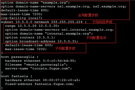 标准的DHCP配置文件包括全局配置参数、子网网段声明、地址配置选项以及地址配置参数: