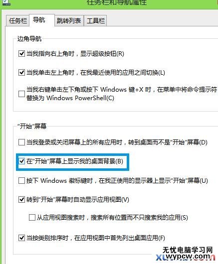 在“任务和导航属性”窗口点击“导航”选项卡,勾选“开始屏幕”选单下的“在“开始”屏幕上显示我的桌面背景”,点击应用或确定;
