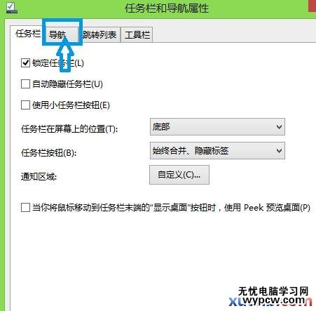 在桌面鼠标右击任务栏空白处,弹出快捷菜单,选择“属性”,弹出“任务和导航属性”窗口;
