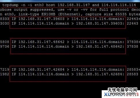 tcpdump -n -i eth0 host 192.168.31.147 and 114.114.114.114
