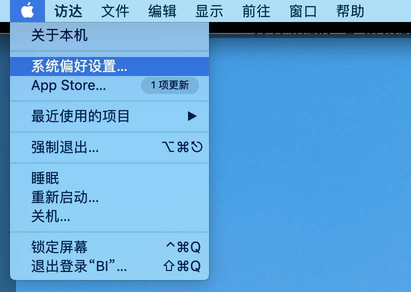 1、首先我们点击左上角的LOGO苹果图标,在弹出的菜单中选择系统偏好设置,如下图所示。
