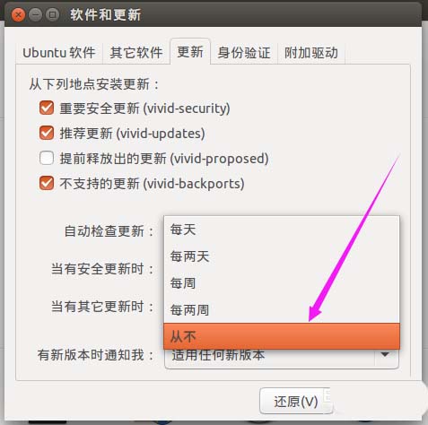 5、在自动检查更新中,我们点击之后,选择“从不”,如图示。