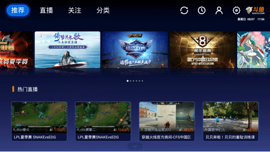 斗鱼TV以游戏直播为主。提供高清、快捷、流畅的视频直播和游戏赛事直播服务,包含英雄联盟lol直播、dota2直播、美女直播等各类热门游戏赛事直播和各种名家大神游戏直播,内容丰富,推送及时,带给你不一样的视听体验,一切尽在斗鱼全民游戏直播平台。(备注:小米盒子等部分盒子,可能会出现小部分直播间因主播推送码率较高导致音画不同步的情况,请关闭弹幕或调整清晰度,即可解决。)
