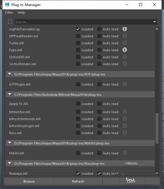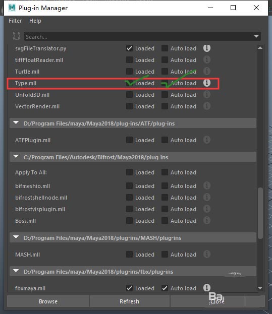 3、在插件管理器中找到type.mll,勾选后面的选项