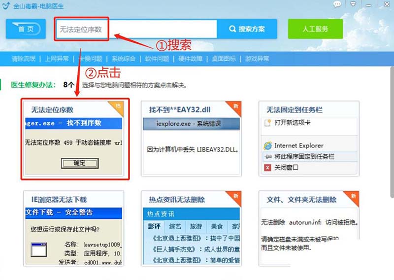 出现“无法定位序数”弹窗的原因,有可能是由于操作失误导致系统文件或程序安装目录中的dll文件被删除。可以在【金山毒霸dll修复】专区下载丢失dll文件。