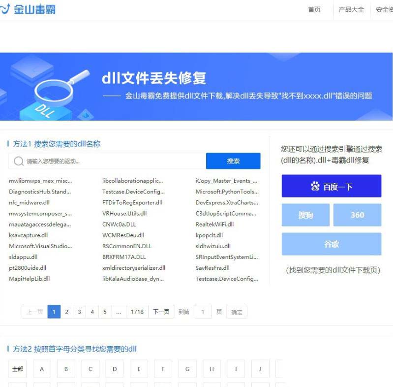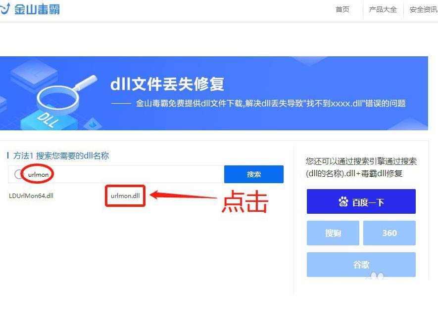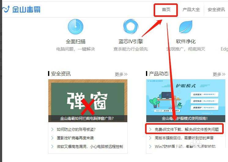 1、进入金山毒霸官网,点击【首页】→【产品动态】→【免费dll文件下载,解决dll文件丢失问题】。