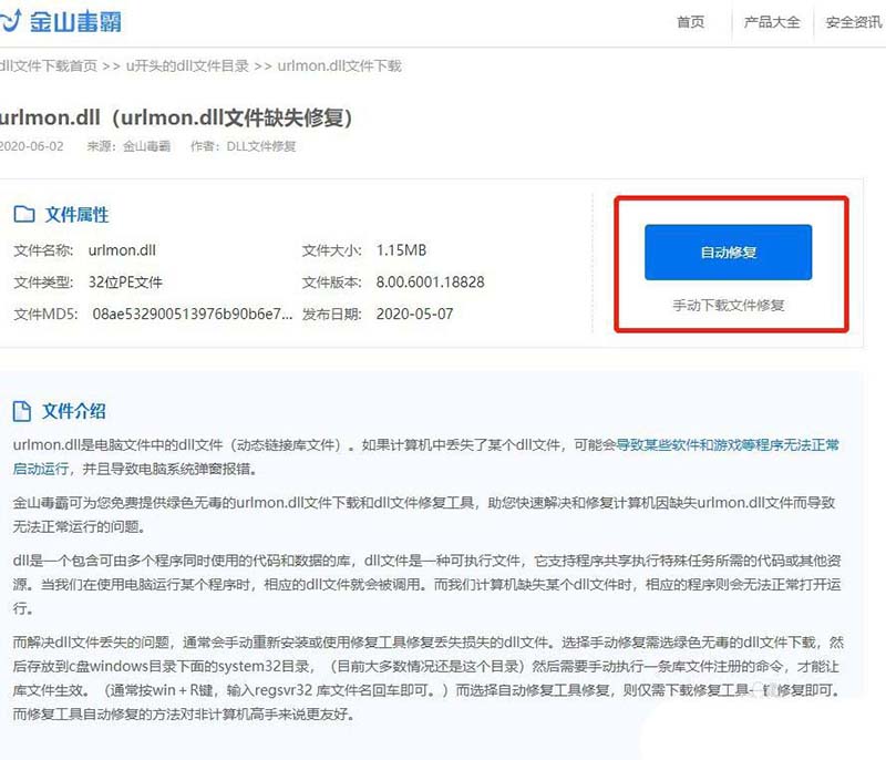 3、在弹出的页面点击【自动修复】就可以啦,毒霸dll文件修复工具可以直接进行修复。