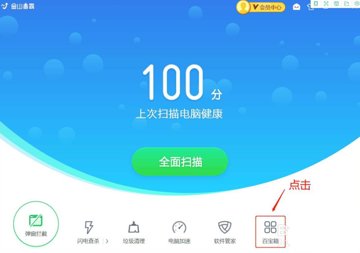 2、打开【金山毒霸】,点击右下角的【百宝箱】。