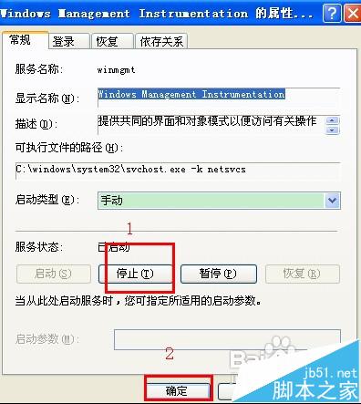2、服务的对话框中,右侧窗口选择"Windows Management Instrumentation”服务选项,单击“停止”,然后按钮“确定”,如图