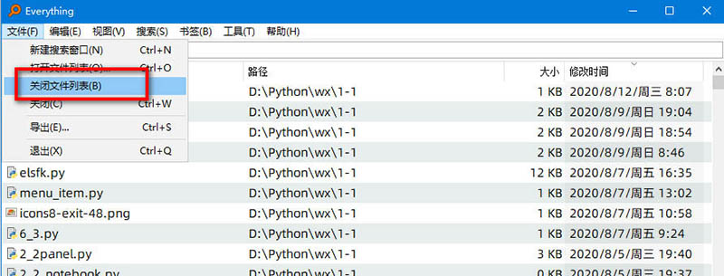 8、使用完成后,记得点击文件→关闭文件列表命令,不然不会搜索所有文件。