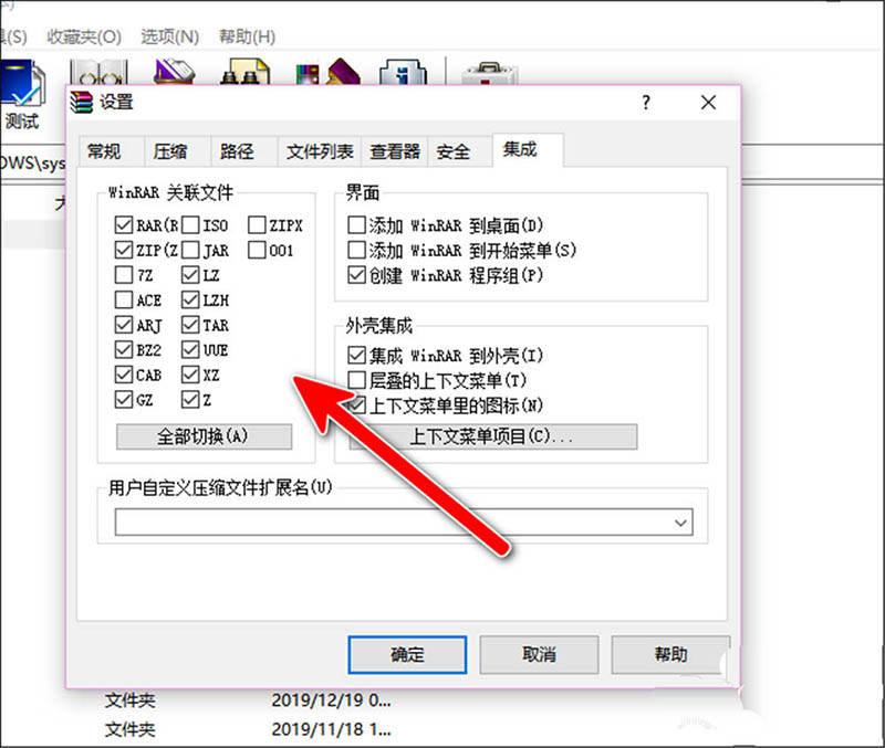 5、然后再“集成”设置栏里,就能找到“WinRAR关联文件”,勾选要关联的类型,或者去掉√取消关联。