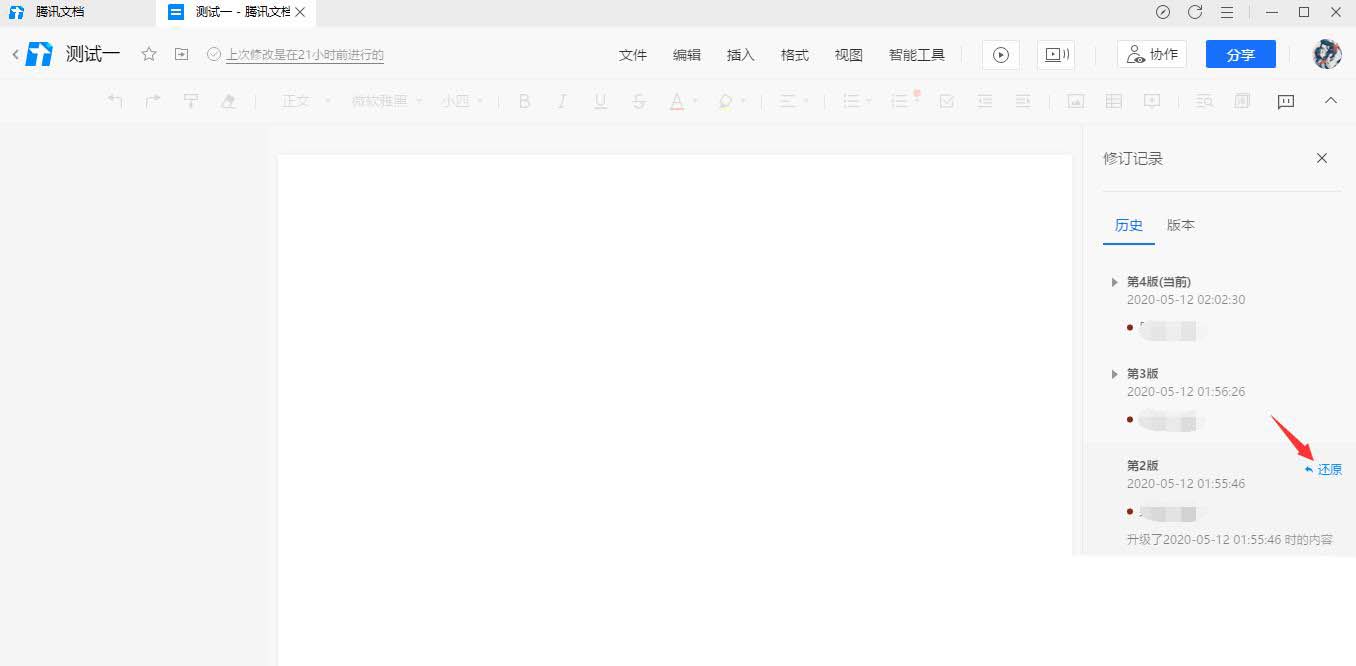2、在文档界面右侧选中需要恢复的修订记录历史版本后,点击右侧的还原选项。