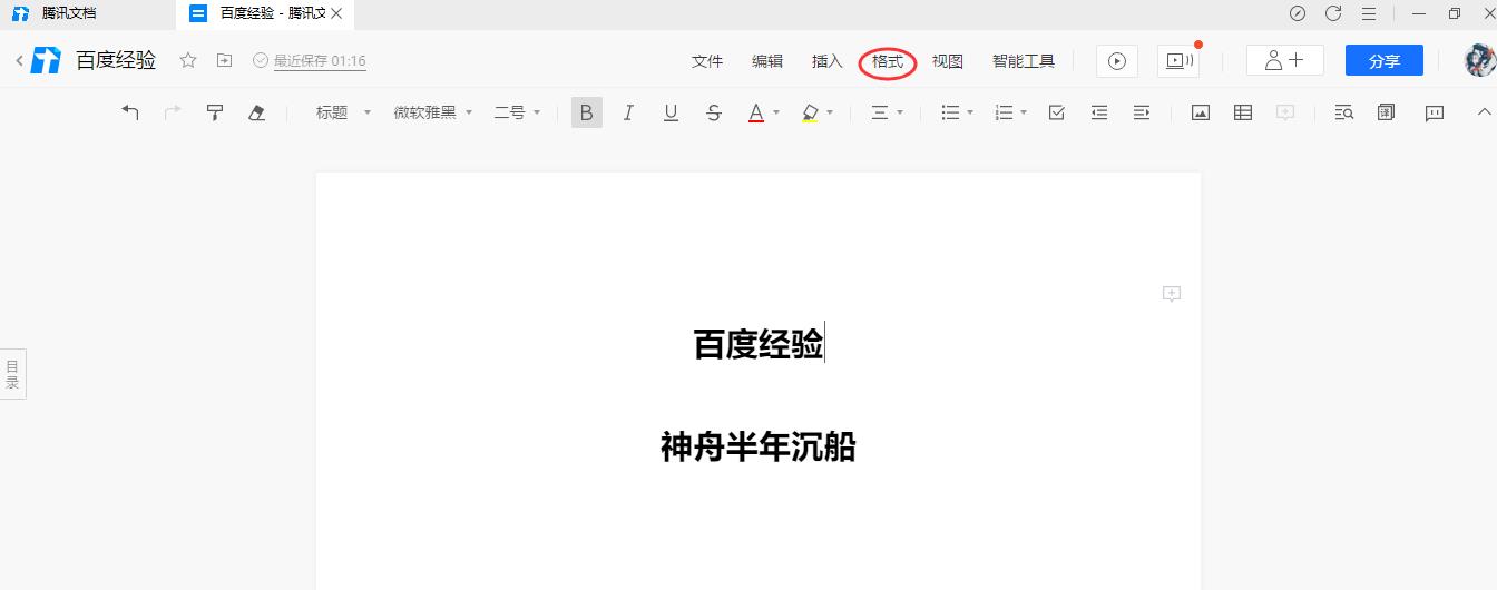 3、在打开的文档界面中,点击上方一栏的格式按钮
