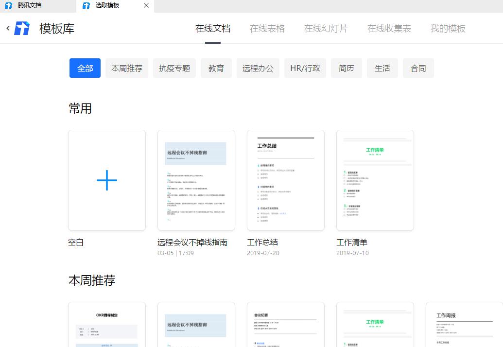 2、在加载出的模板库界面,选择在线文档所需要用的模板。