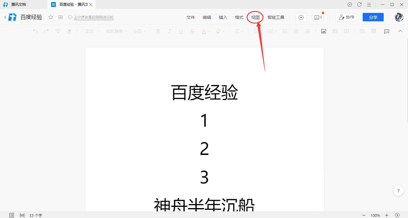 2、在打开的文档界面中,点击上方一栏的视图按钮
