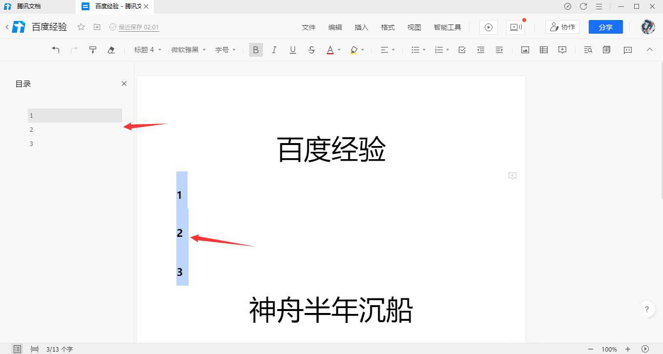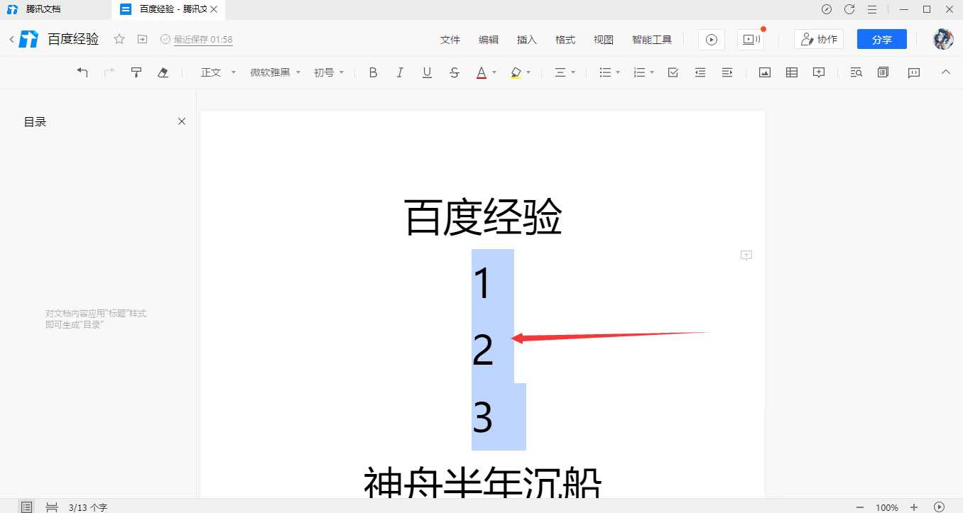 7、这样在线文档的目录就生成完毕了,如果需要修改目录文字,直接修改对应目录区域的文字就可以了。