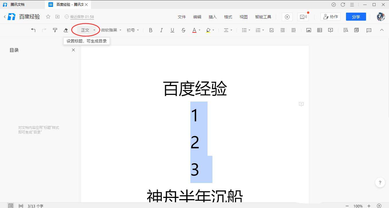 5、选中需要设置目录的区域后,点击上方菜单栏的正文按钮