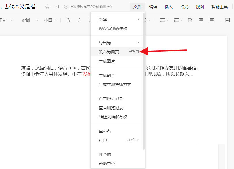 3、点击下拉菜单中的“发布为网页 已发布”。