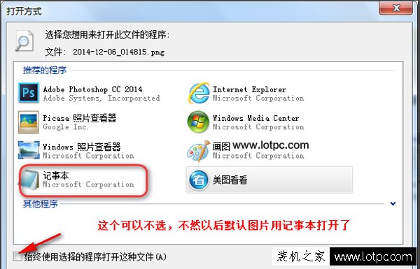 这时,在打开方式的推荐的程序菜单中,我们找到“记事本”,并确定打开。注:始终使用选择的程序打开这种文件,建议不要勾选,否则每一次打开这种格式的图片都会使用记事本方式打开。