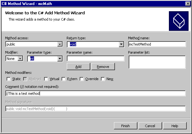 将会弹出C#方法设计器. 填入方法名称、访问类型、返回值类型、参数名字和注释。使用【添加】或【移除】按钮从参数列表中添加或删除参数。这里添加了一个无参测试方法:mcTestMethod. 参加下图5.