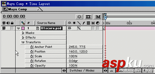 3 在时间标尺视窗中,确认01score.Psd层是被选取的层,单击素材层左边的小三角形图标以展开层的属性轮廓,Geometric属性显示出来。