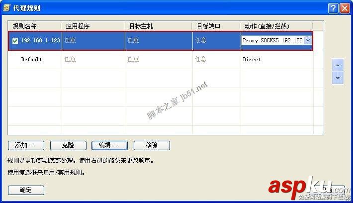 2) 在弹出的“代理规则”对话框中,选中“192.168.1.123”复选框,单击“动作(直接/拦截)”组合框,选择“Proxy SOCKS 192.168.1.123”,再单击“确定”按钮。
