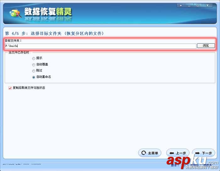 将U盘中,需要恢复的文件与目录勾选完毕后,点击“下一步”按钮,将这些文件与目录拷贝出来,数据恢复精灵会弹出如下窗口,你可设定恢复文件与目录的目标文件夹: