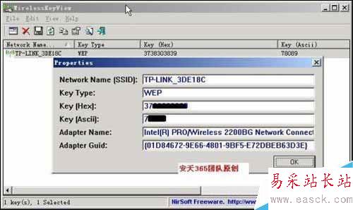 在wirelesskeyview中双击获取的密码选项,即可出现如图3所示的密码详细属性显示窗口,该窗口中是属性值可以直接Copy。