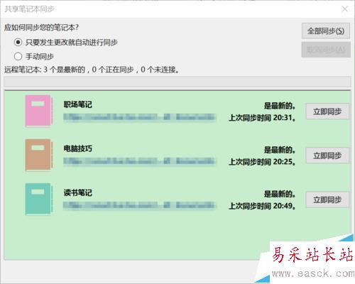 6、点击查看同步状态,可以根据自己的需求选择只要发生更改就自动进行同步或手动同步。如果更新了笔记而同步未完成,也可以选择全部同步或立即同步。