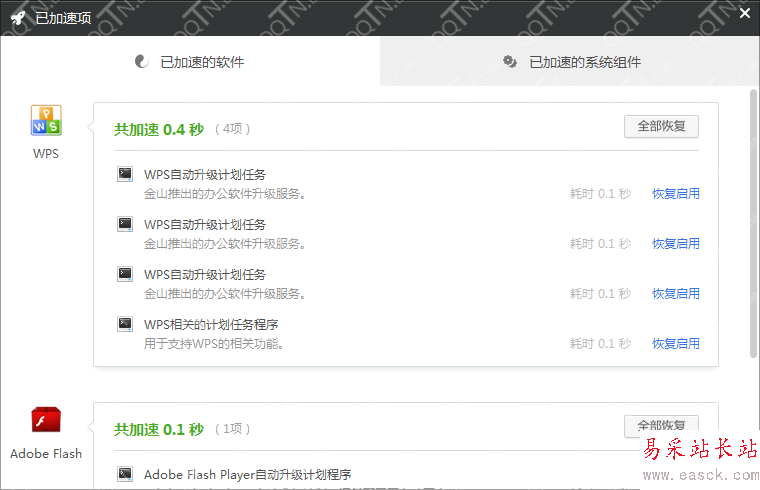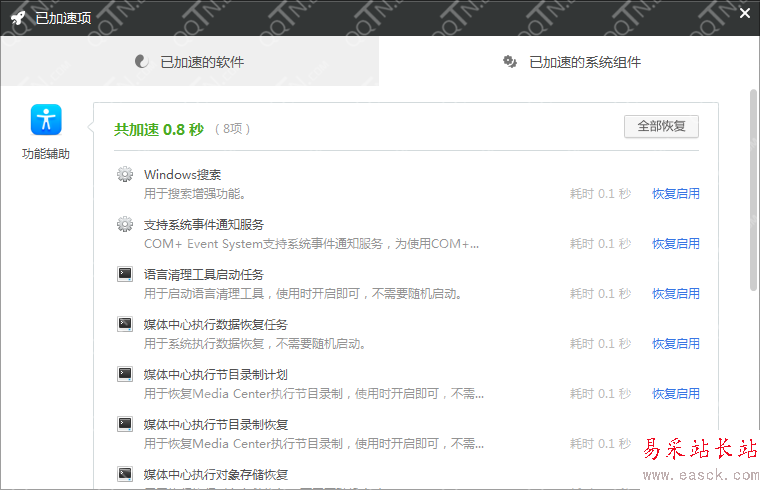 5、同时可以在下载进入已加速项管理,已经加速的软件和已经加速的系统组件,可以在这恢复启动