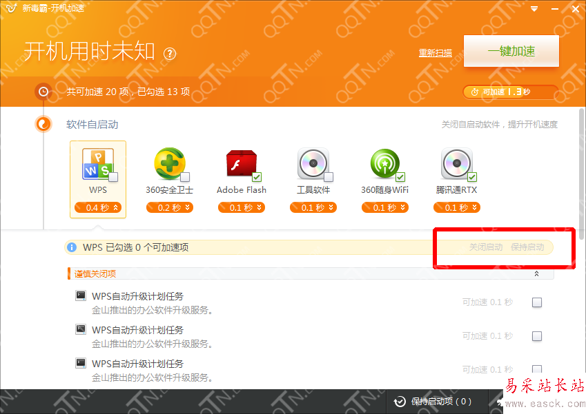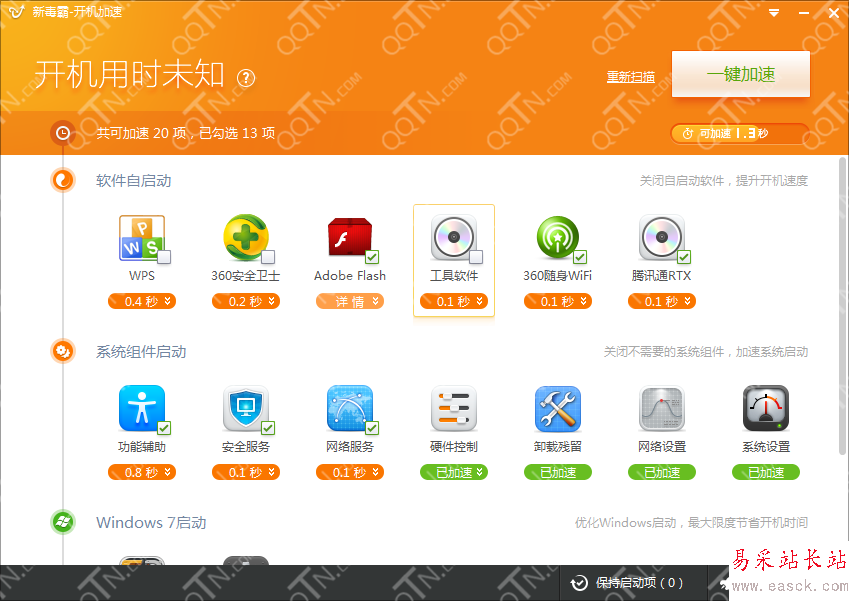 4、同时可以点击一键加速,加速之后,会自动关闭一些无用的启动项