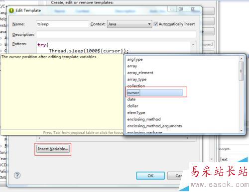 4、注意上图中输入的${cursor},这是通过点击“Insert Variable...“插入光标。还有更多的选项,可以自己尝试下。