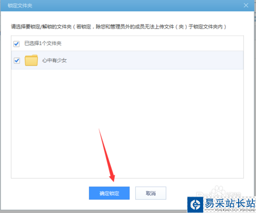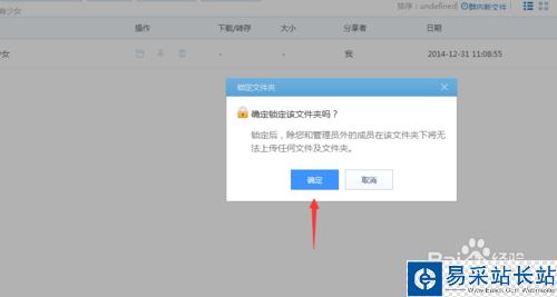 7、点击之后,会有一个提示,提示你锁定之后,只有管理员或者群主才能够向里面上传东西,我们点击【确定】即可。