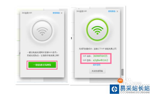 在弹出的360连我wife界面点击《一键创建无线网络》,这时等待360自动创建无线网络,创建成功后,根据360连我wife提供的账号密码,你就可以连接无线网络使用了。