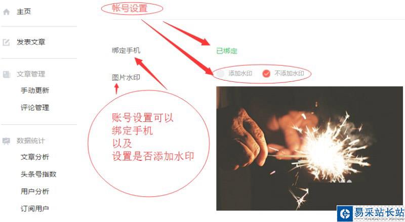 6、设置:账号信息,你可以修改你的头条号名称,头条号介绍,联系头像,等。账号状态,在这里,你可以申请一些功能。账号设置,你可以绑定你的手机,以及设置图片是否添加水印。