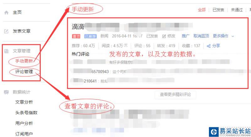 3、文章管理:手动更新,你可以在这里看到你发布的文章,以及文章的相关数据,推荐量,阅读量,评论数,转发数,收藏数,还可以进行分享。评论管理,你可以看到文章的评论,进行回复,以及推荐评论。