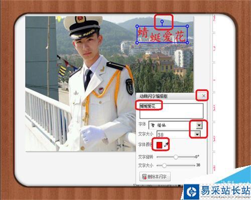 4、在右侧选择自己喜欢的动画文字,单击一下,出现动画文字编辑框,输入自己要添加的文字。选择文字的颜色,大小,字体,调整一下文字的位置,关闭就可以了。