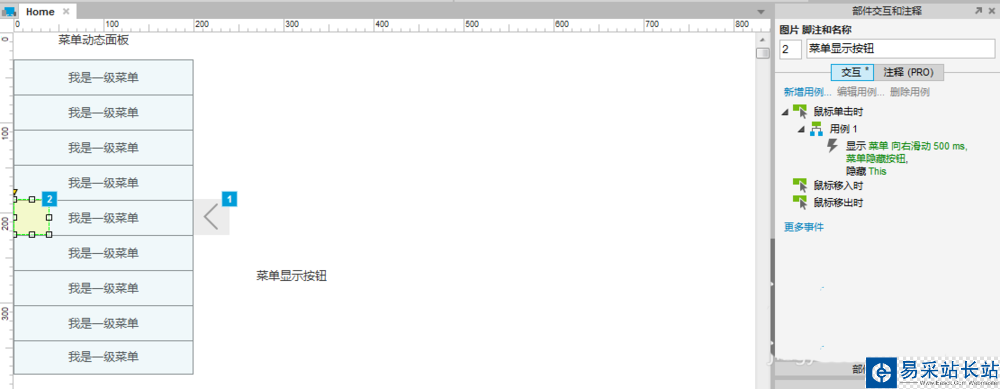 2、菜单与图片的显示,要按照自己的要求来设定,比如若想要进入页面后,页面的菜单是显示状态的,则菜单与菜单隐藏按钮直接显示出来,菜单的显示按钮隐藏掉即可,反之,则要隐藏掉菜单与菜单隐藏按钮,直接显示出菜单显示按钮,此外将菜单的显示/隐藏按钮做成动态面板,通过点击来回切换,也是可行的。