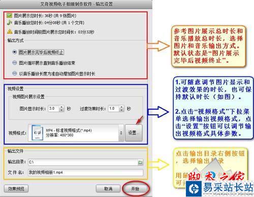 可以选择输出方式、图片展示与视频格式、输出文件目录和文件名,也可以保持软件默认设置,设置完成之后,点击开始按钮,即可完成制作。