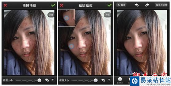 但,如果你的痘痘肌或者斑点基底比较明显,那小编建议你先用美图秀秀“祛斑祛痘”功能修复下。选中需要处理的痘痘或者斑点,手指轻轻触摸就可以看到斑斑点点都不见了,没有瑕疵的脸部看起来是不是美了许多呢?