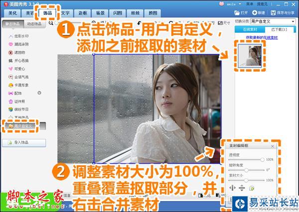3、点击“饰品-用户自定义”选项,添加之前抠取的素材;调整素材大小为100%重叠覆盖抠取部分,并右击合并素材。
