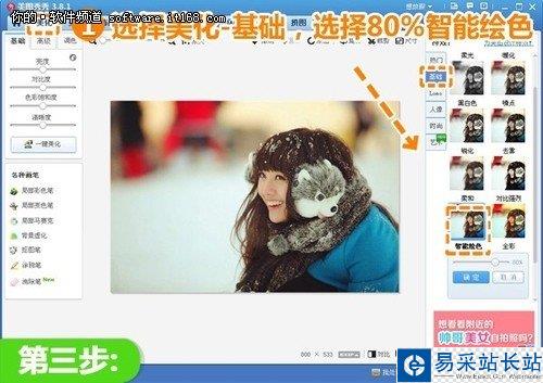 3、 然后再返回“基础”分类,选择透明度为80%的“智能绘色”特效,增强整个画面的色彩感。