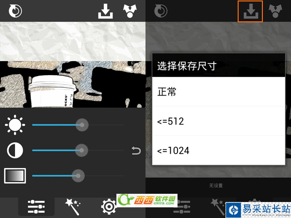 而用户点击底部第一个图标就可以对素描效果进行更仔细的设置,照片修改完后,点击右上角的保存按钮,可以保存不同大小的照片。