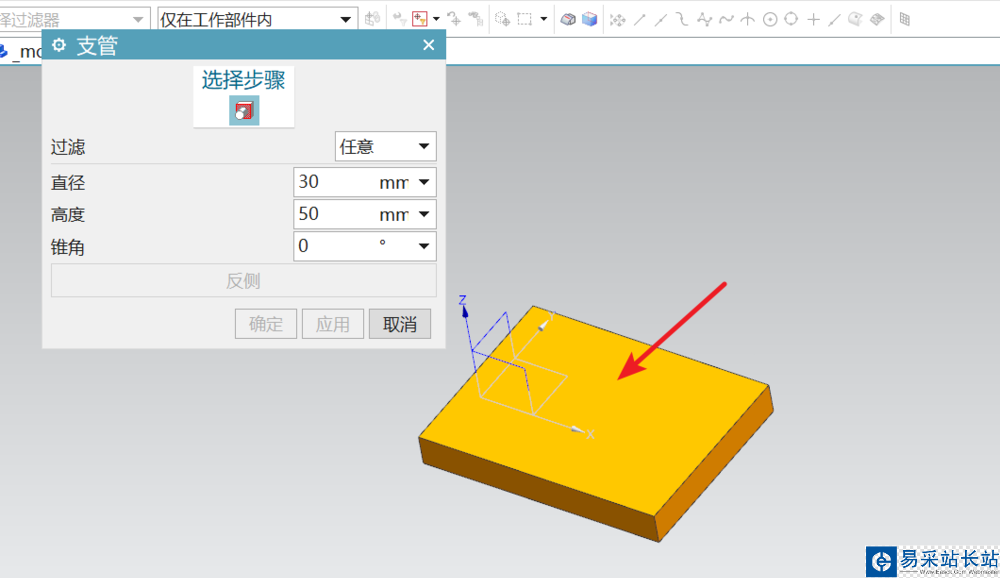 2、在立方体的上面添加凸台,直径30高度为50;定位于立方体的中心位置。